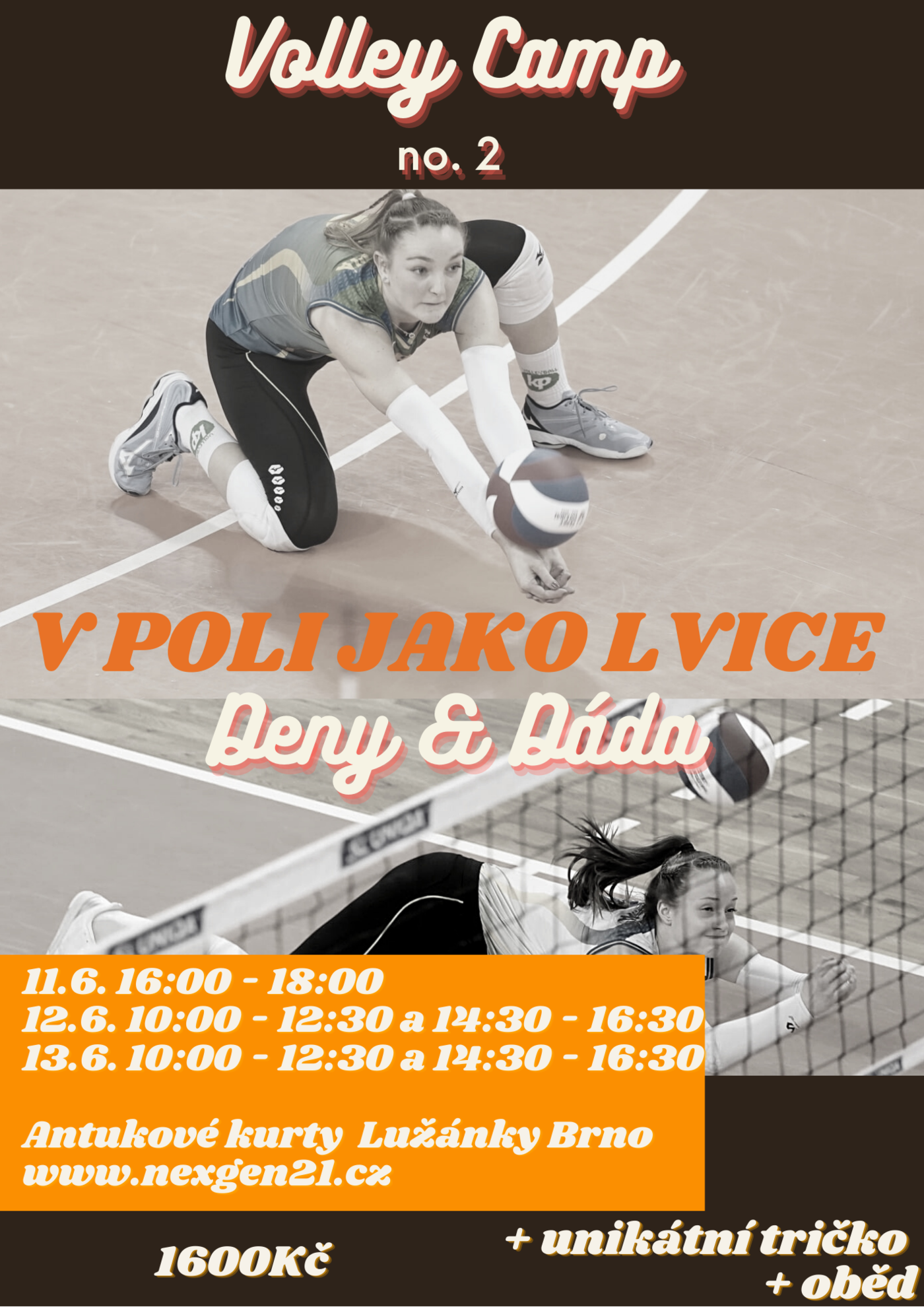 Třídenní příměstský volejbalový kemp určený pro HRÁČKY zejména ročníku 2007 a mladší. Kemp probíhá pod vedením trenéra Erika Nezhody a profesionálních volejbalistek. Trenérkami na kempu budou tentokráte dvě mimořádné a mladé hráčky Králova Pole a české reprezentantky Daniela Digrinová a Denisa Pavlíková. Kemp je zaměřen na základní volejbalové činnosti s důrazem na obranu v poli, přihrávku míče letícího před síť volejbalovým hrám typu 2 na 2, 3 na 3 a další.